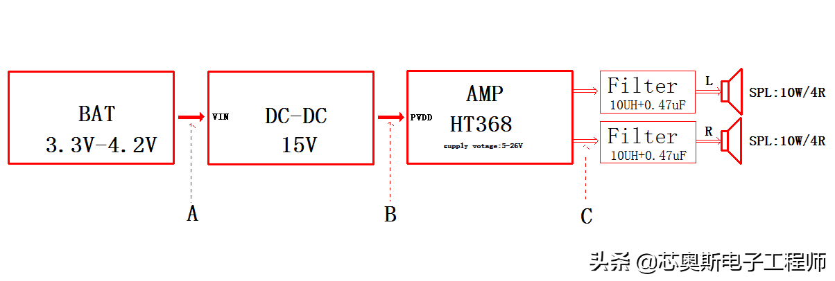 3). DC-DC輸出端的電解電容耐壓值應該選取25V,包括功放供電腳的電容也一樣;