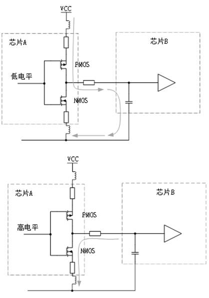 (3)內(nèi)部晶體管工作需要內(nèi)核時(shí)鐘或是外部時(shí)鐘同步,但是由于內(nèi)部延遲及各個(gè)晶體管不可能嚴(yán)格同步,造成部分晶體管完成狀態(tài)轉(zhuǎn)換,另一部分可能處于轉(zhuǎn)換狀態(tài),這樣一來處于高電平門電路的電源噪聲會(huì)傳到其它門電路的輸入部分。