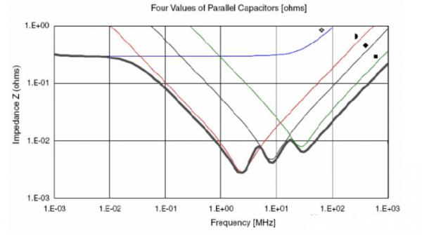 用一個(gè)電容組合的例子。這個(gè)組合使用的電容為:2個(gè)680uf鉭電容,7個(gè)2.2uf陶瓷電容(0805封裝),13個(gè)0.22uf陶瓷電容(0603封裝),26個(gè)0.022uf陶瓷電容(0402)。圖中上部平坦的曲線是680uf電容的阻抗曲線,其它三個(gè)容值的曲線為為圖中三個(gè)V字曲線,從左到右2.2uf →0.22uf→ 0.022uf?偟淖杩骨為底部粗包路線。