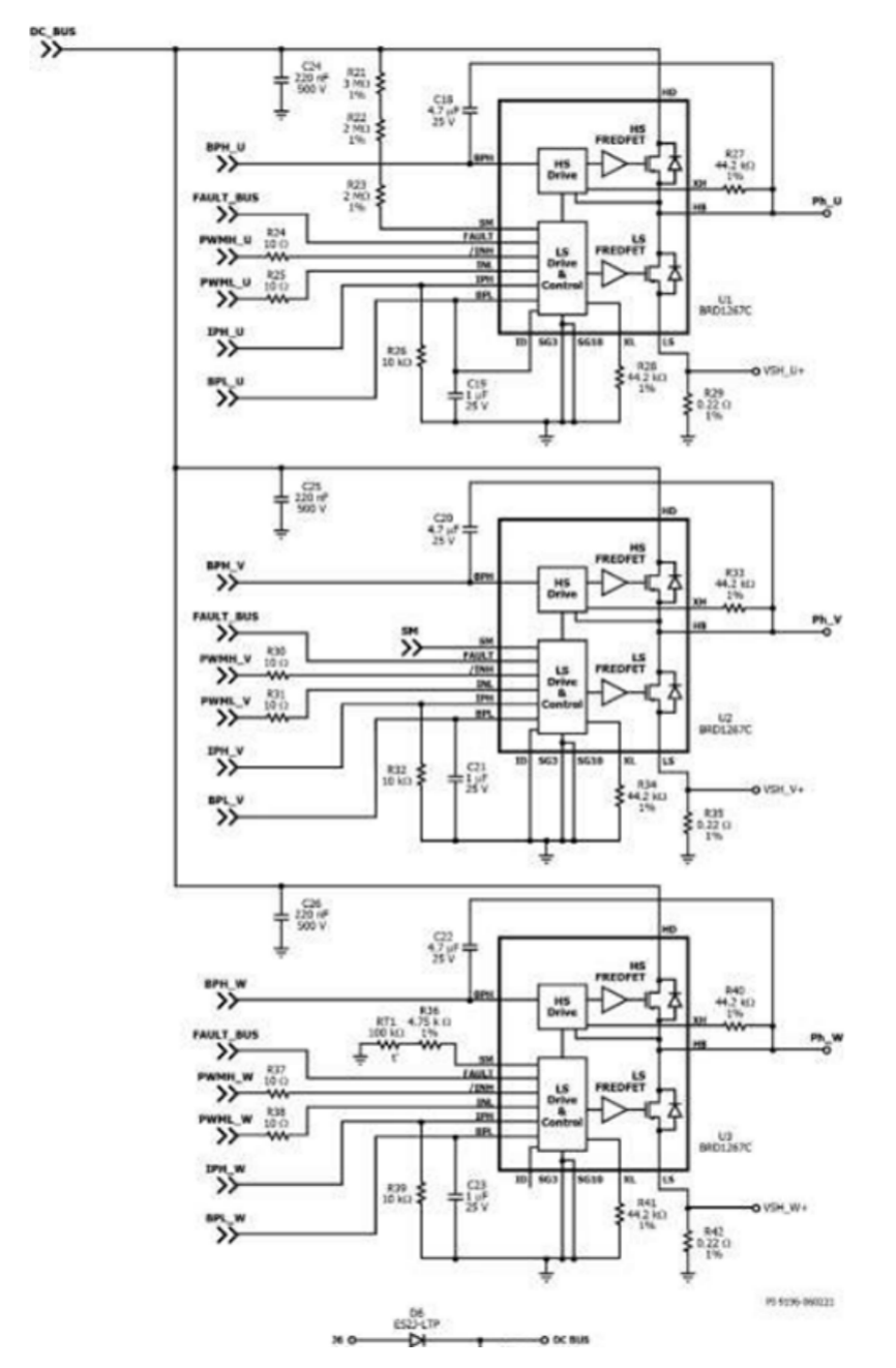 該評(píng)估板使用三顆BridgeSwitch™ BRD1267C 半橋器件,原理圖如下所示