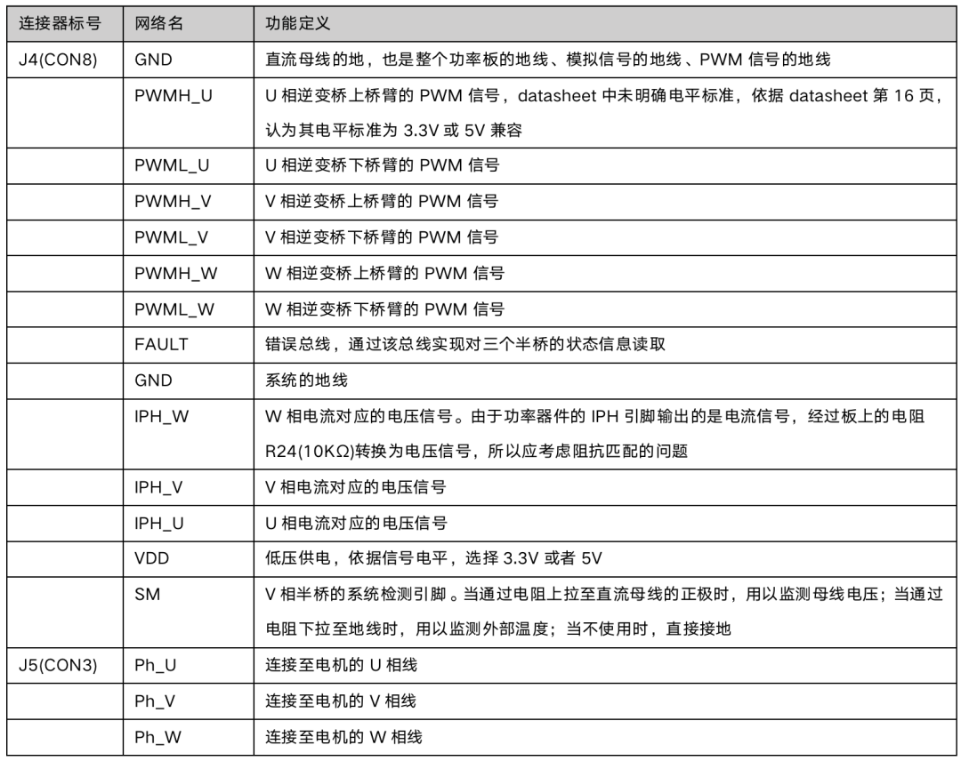 此外,該評(píng)估板的關(guān)鍵電信號(hào)主要包括:半橋功率器件,相電流與電流信號(hào)的對(duì)應(yīng)關(guān)系為400uA/A,電流信號(hào)轉(zhuǎn)電壓信號(hào)所使用的電阻值為10KΩ,對(duì)應(yīng)電壓信號(hào)為4V/A,該半橋最大輸出電流為0.7A,對(duì)應(yīng)最大輸出電壓為2.8V;半橋的上橋臂使用的PWM信號(hào)為低邏輯,即當(dāng)該P(yáng)WM信號(hào)為低時(shí),對(duì)應(yīng)上的上橋臂導(dǎo)通;器件ID,逆變橋使用三個(gè)半橋功率器件,該三個(gè)半橋使用同一根FAULT_BUS信號(hào)與微控制器通信,因此需要設(shè)置每個(gè)半橋的通信識(shí)別ID,通過將半橋功率器件的ID引腳分別:連接至BPL引腳、懸空、連接SG引腳共三種方式來(lái)設(shè)置三個(gè)ID,微控制器具有默認(rèn)的ID,因此無(wú)需設(shè)置。