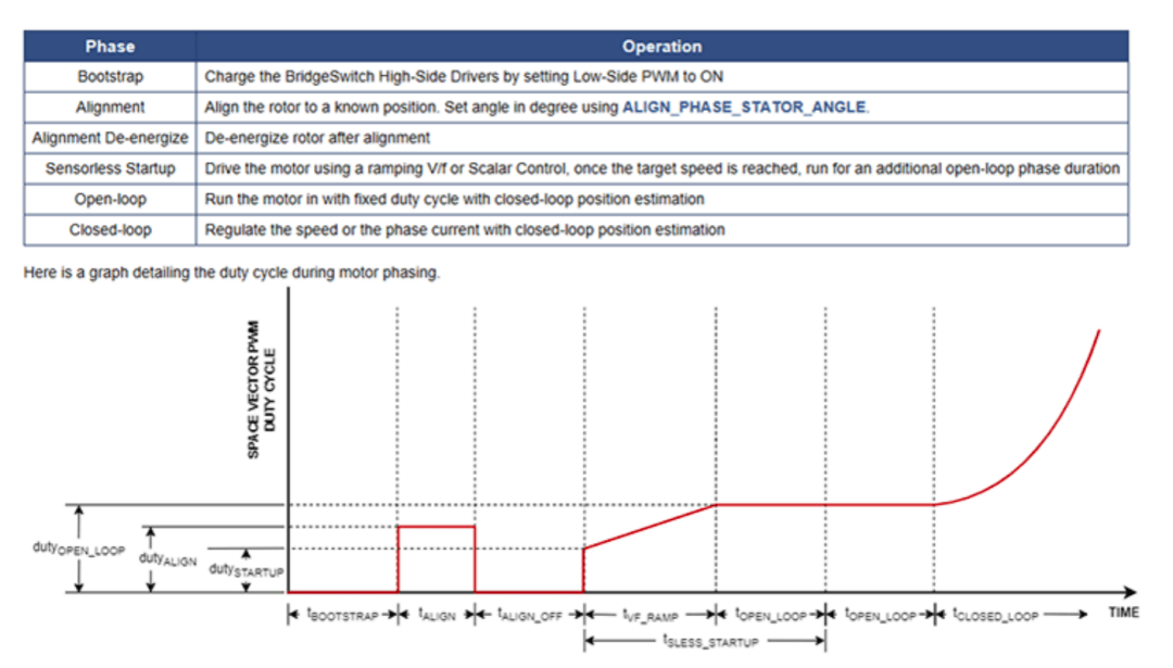 Sensorless Startup階段:此階段通過開環(huán)拖動(dòng),使電機(jī)轉(zhuǎn)速逐漸提高至設(shè)定的轉(zhuǎn)速值。