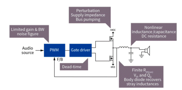 開關(guān)損耗是另一個(gè)需要充分考慮的因素。在中高功率輸出電平下,D類放大器的性能異常出色。但是,由于功率器件中的損耗,效率最低的是最低功率輸出。