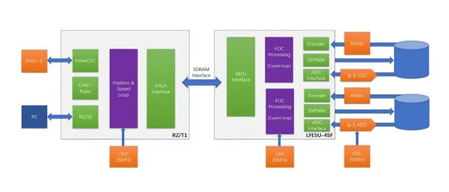 除了ASIC,F(xiàn)PGA也被用于實現(xiàn)FOC控制算法,例如中電港聯(lián)合全球知名半導(dǎo)體解決方案供應(yīng)商瑞薩電子及萊迪思半導(dǎo)體推出高性能EtherCAT伺服驅(qū)動解決方案,采用Renesas MPU+Lattice FPGA雙芯片架構(gòu)。