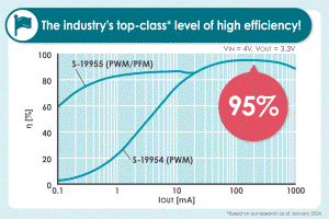 「S-19954/5系列」的高效率在功能相同產(chǎn)品中達到了業(yè)界最高水準(zhǔn)(在輸入電壓4V、輸出電壓3.3V時為95%)的功率轉(zhuǎn)換效率。