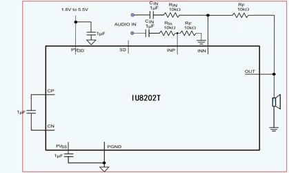 IU8202T采用單端模式輸出,其直驅(qū)模式結(jié)構(gòu)單電源供電時(shí)能夠產(chǎn)生以地為參考的輸出,從而省 去了大尺寸的隔直電容,既節(jié)省了成本和電路板空間, 也降低了元件的高度。