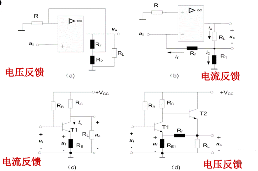 將輸出電壓‘短路’,或令負(fù)載R=0,如果此時(shí)反饋信號(hào)不存在了,即X=0,則是電壓反饋;若反饋信號(hào)仍然存在,則是電流反饋。