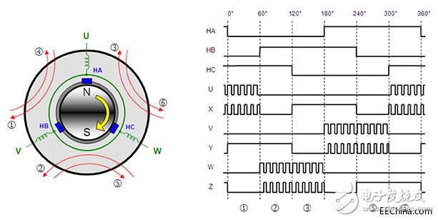 圖 1: BLDC 電機(jī)的供電方式是通過(guò)使用 PWM 信號(hào)順次激勵(lì)繞組。 PWM 信號(hào)的占空比與驅(qū)動(dòng)電壓成比例。 在本圖中,“U”、“V”和“W”是繞組,“HA”、“HB”和“HC”是位置感應(yīng)霍爾效應(yīng)傳感器。
