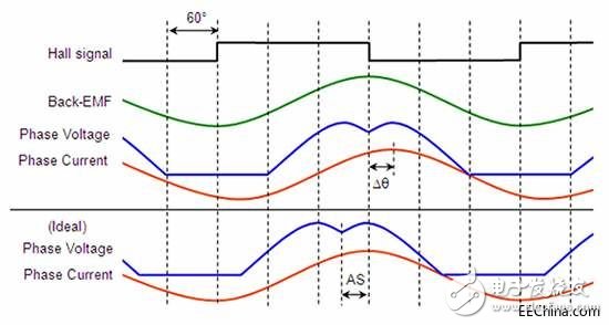 圖 4: 在非補(bǔ)償正弦控制 BLDC 電機(jī)中,相位電流延遲反電動(dòng)勢(shì),造成了效能低下(上圖)。 許多驅(qū)動(dòng)器芯片包括超前相角,這允許設(shè)計(jì)人員卻定電流相位,使其與反電動(dòng)勢(shì)保持一致(下圖)。