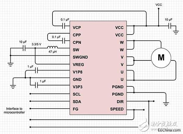 圖 5: Texas Instruments 的 DRV10983 使設(shè)計(jì)人員能夠創(chuàng)建一個(gè)正弦控制的 BLDC 電機(jī)系統(tǒng),其中包括低成本的 MCU 和一小部分的無(wú)源元器件。