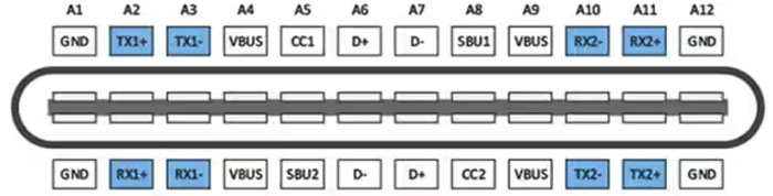 藍(lán)色突出顯示的引腳包括四個(gè)差分信號(hào)對(duì),形成了兩個(gè)支持 SuperSpeed USB 的數(shù)據(jù)通道。USB 3.2 第 2x1 代支持 10 Gbps 的數(shù)據(jù)速率,USB 3.2 第 2x2 代支持 20 Gbps 的數(shù)據(jù)速率,而 USB4 第 3x2 代則支持 40 Gbps 的數(shù)據(jù)速率。