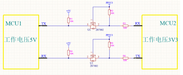 先說一說這個電路的用途: 當(dāng)兩個MCU在不同的工作電壓下工作 (如MCU1工作電壓5V;MCU2工作電壓3.3V),那么 MCU1與MCU2之間怎樣進行串口通信呢? 很明顯是不能將對應(yīng)的TX、RX引腳直接相連的,否則可能造成較低工作電壓的MCU燒毀!