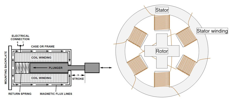圖 1:螺線管的結(jié)構(gòu)包括帶內(nèi)部滑動(dòng)柱塞的繞接線圈(左圖);步進(jìn)電機(jī)則更為復(fù)雜,轉(zhuǎn)子上有永磁體,定子上有電磁線圈(右圖)。(圖片來源:Analog Devices、Monolithic Power Systems)