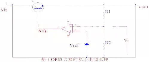 正向輸入端子與基準(zhǔn)電壓Vref相連,Vs=Vout*R2/(R1+R2).由于放大信號(hào)ΔVs為負(fù)值,控制晶體管的基級(jí)電壓下降,因此輸出電壓減小在正常情況下,必有Vref=Vs=Vout*R2/(R1+R2),調(diào)整R1,R2之比可設(shè)定所需要的輸出電壓值。