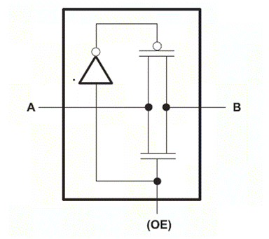 圖2為NO/NC口的FET(傳輸門)的原理圖,由一個N溝道晶體管和一個并聯(lián)的P溝道晶體管組成,當OE端輸入為高時,經(jīng)過反相器后,P溝道導通,N溝道導通,此時A到B導通。與之相反,當OE端輸出為低時,P溝道與N溝道阻斷,此時A到B關(guān)斷。