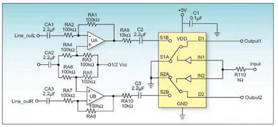修正以上兩個錯誤后,該音頻應(yīng)用電路便可以正常工作了。由以上實例可以看出,充分理解模擬開關(guān)的基本概念是正確應(yīng)用模擬開關(guān)的基礎(chǔ)。