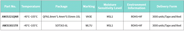 AW35321QNR采用綠色環(huán)保的小體積QFN 1.8mm * 1.4mm * 0.55mm – 10L封裝。0.5Ω(典型值)超低導通電阻以及只需要單電源供電即可支持負擺幅信號的特性使其非常適合應(yīng)用于音頻領(lǐng)域該封裝占板面積小,非常適用于手機、PAD、超薄本等內(nèi)部空間緊湊的電子設(shè)備。