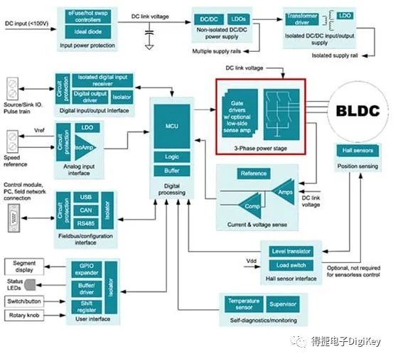 圖3:Texas Instruments的C2000微控制器專為電機控制應用而設(shè)計。此圖為應用實例,中間是微控制器,其余為驅(qū)動BLDC電機的必需和可選電路。(圖片來源:TexasInstruments)