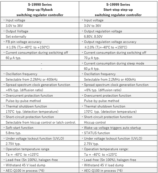 S-19990/9系列還應(yīng)對(duì)PPAP(Production Part Approval Process: 生產(chǎn)零件批準(zhǔn)程序),有關(guān)車載用IC的品質(zhì)規(guī)范AEC(*)-Q100 Grade1(*Automotive Electronics Council: 汽車電子協(xié)會(huì))正在應(yīng)對(duì)中。