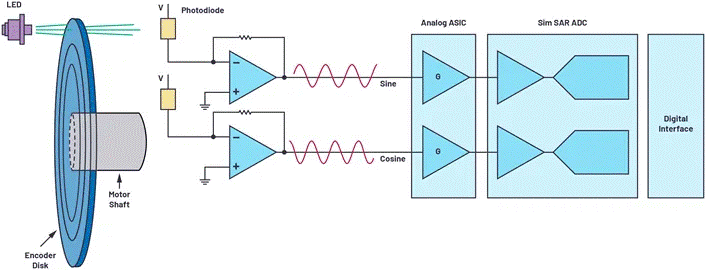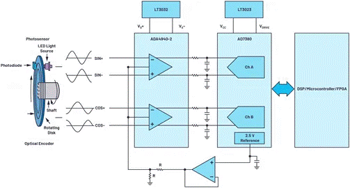 在低端應(yīng)用中,使用增量傳感器和比較器可能就能夠?qū)嵤┪恢脵z測,但在高端應(yīng)用中,則需要更加復(fù)雜的信號鏈。這些反饋系統(tǒng)包含位置傳感器,之后是模擬前端信號調(diào)理、ADC,以及ADC驅(qū)動器,數(shù)據(jù)先經(jīng)過它們,之后再進入數(shù)字域。其中最精確的位置傳感器就是光學(xué)編碼器。光學(xué)編碼器由LED光源、連接到電機軸的標(biāo)記圓盤和光電探測器組成。圓盤包含不透明和透明的掩碼區(qū)域,可以阻隔光線或讓光線通過。光電探測器檢測這些光線,開/關(guān)光信號則轉(zhuǎn)換為電子信號。隨著圓盤轉(zhuǎn)動,光電探測器(與圓盤的模式配合)生成小的正弦和余弦信號(mV或µV等級)。這種系統(tǒng)是絕對位置光學(xué)編碼器采用的典型系統(tǒng)。這些信號進入模擬信號調(diào)理電路(一般由分立式放大器或模擬PGA組成,用于獲取高達1 V峰峰值范圍的信號),通常是為了讓ADC輸入電壓范圍匹配最大動態(tài)范圍。每個放大的正弦和余弦信號之后都被同步采樣ADC的驅(qū)動放大器捕捉。ADC的每個通道都必須支持同步采樣,以便同時獲取正弦和余弦數(shù)據(jù)點,由這些數(shù)據(jù)點組合提供軸的位置信息。ADC轉(zhuǎn)換結(jié)果會發(fā)送給ASIC或微控制器。電機控制器在每個PWM周期中查詢編碼器位置,然后根據(jù)接收的指令使用該數(shù)據(jù)來驅(qū)動電機。過去,為了集成到有限的板空間中,系統(tǒng)設(shè)計人員必須犧牲ADC速度或通道數(shù)。
