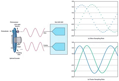 隨著技術(shù)不斷發(fā)展,導(dǎo)致需要實施高精度位置檢測的電機控制應(yīng)用不斷創(chuàng)新。光學(xué)編碼器的分辨率可能由圓盤上精細(xì)光刻的槽數(shù)決定,通常有幾百或幾千個。將這些正弦和余弦信號插入到高速、高性能ADC中之后,無需對編碼器圓盤實施系統(tǒng)變更,即可創(chuàng)建出分辨率更高的編碼器。例如,以更低的速率對編碼器的正弦和余弦信號采樣時,只會捕捉到少數(shù)信號值,具體如圖3所示;這會限制位置電容的精度。在圖3中,當(dāng)ADC以更快速率采樣時,可以獲取更詳細(xì)的信號值,從而更精準(zhǔn)地確定位置。ADC的高速采樣速率支持過采樣,進一步改善噪聲性能,消除了一些數(shù)字后處理需求。與此同時,可以降低ADC的輸出數(shù)據(jù)速率;也就是說,支持較慢的串行頻率信號,因此簡化了數(shù)字接口。電機位置反饋系統(tǒng)安裝在電機總成上,在某些應(yīng)用中,總成可能非常小巧。所以,能否裝入編碼器模塊面積有限的PCB區(qū)域中,尺寸大小是關(guān)鍵。在單個微型封裝中集成多個通道組件非常有利于節(jié)省空間。