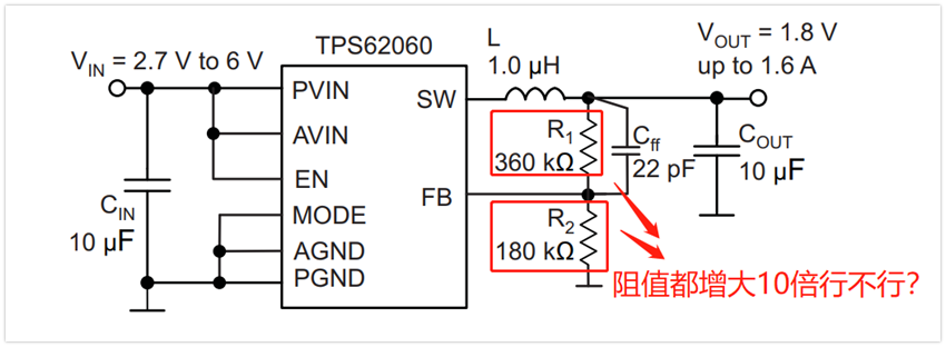 但是,總會有個別人可能想過:我想降低系統(tǒng)功耗,因此想讓FB的分壓電阻成倍增大,那到底有沒有風(fēng)險呢?