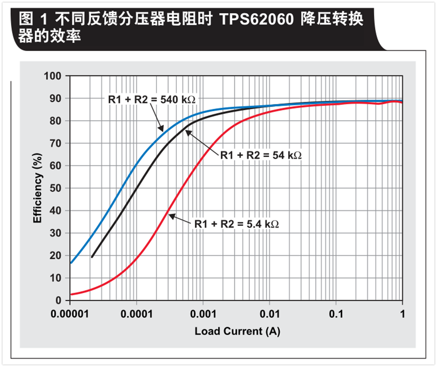 我們剛剛討論了如何利用大反饋電阻來提高效率。然而,選擇的電阻過大則會影響轉(zhuǎn)換器的輸出電壓精確度。因為存在進(jìn)入轉(zhuǎn)換器反饋引腳的漏電流。