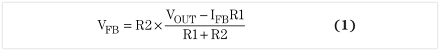 圖2顯示了電阻式反饋分壓器(R1和R2)的電流通路。反饋漏電流(IFB)固定不變時,R1的電流( lR1)隨著R1和R2值增加而減小。因此,分壓器電阻增加也就意味著進(jìn)入反饋引腳的IR1漏電流百分比更大,并且R2的電流(1R2)降低,從而產(chǎn)生低于預(yù)期的反饋引腳電壓( VFB )。我們將 VFB 同一個內(nèi)部基準(zhǔn)電壓比較,以此來設(shè)置輸出電壓,因此反饋電壓的任何一點誤差都會導(dǎo)致輸出電壓不精確。我們可以由基爾霍夫( Kirchhoff )電流定律推導(dǎo)出方程式1.其表明VFB為R1和R2的函數(shù):