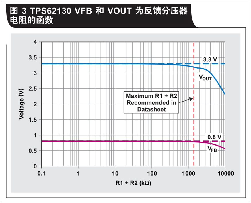 方程式1和TI的TPS62130降壓轉(zhuǎn)換器用于繪制反饋引腳電壓及相應(yīng)輸出電壓情況,其為反饋分壓器電阻的函數(shù)(請參見圖3)。該電壓圖基于理想電阻,其可產(chǎn)生一個3.3V的輸出電壓,并且反饋引腳電壓為0.8V。需要考慮的唯一誤差項是產(chǎn)品說明書中規(guī)定的100nA最大反饋漏電流。