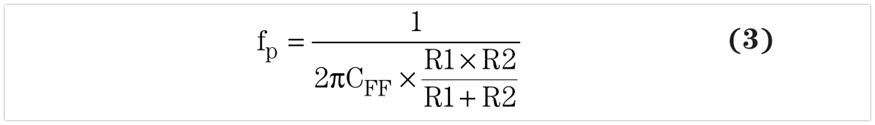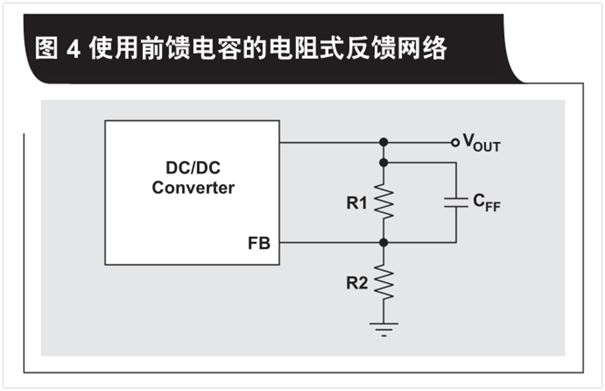 根據(jù)不同的控制拓?fù),產(chǎn)品說明書可能會要求或者建議電阻式反饋網(wǎng)絡(luò)使用前饋電容( CFF )。圖4顯示了這種裝置。給電阻式分壓器添加前饋電容可產(chǎn)生零點和極點,增加轉(zhuǎn)換器的相位裕量和交叉頻率,從而獲得一個更高帶寬、高穩(wěn)定性的系統(tǒng)。