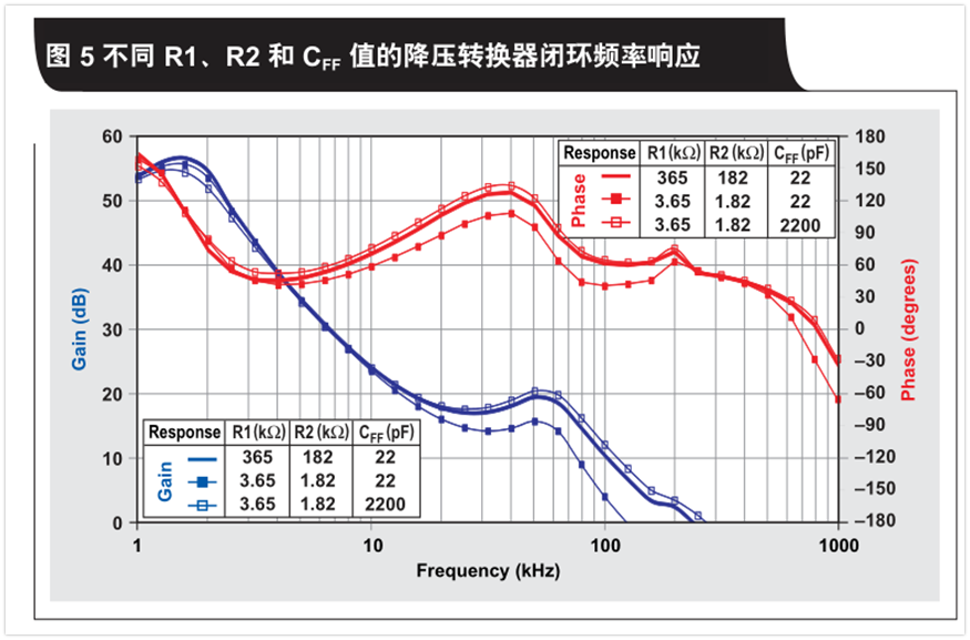 對于一個在其控制拓?fù)渲惺褂们梆侂娙莸霓D(zhuǎn)換器來說,改變電阻式分壓器的值很容易讓轉(zhuǎn)換器穩(wěn)定降低。但是這個例子僅僅表明,只要前饋電容調(diào)節(jié)適當(dāng),改變這些值便可維持相同的頻率響應(yīng)和瞬態(tài)響應(yīng)。