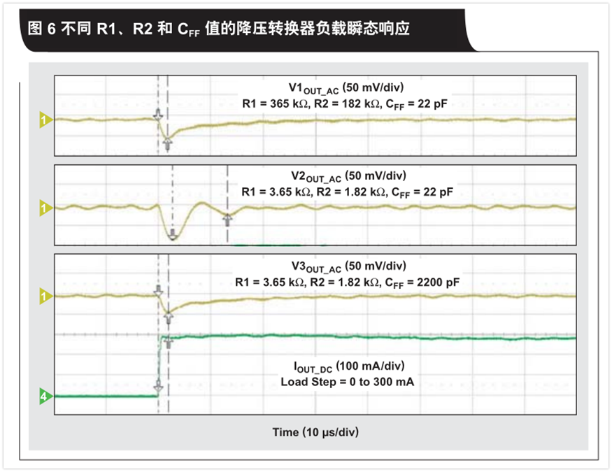 圖5和圖6分別顯示了三種不同電阻式分壓器網(wǎng)絡(luò)的閉環(huán)響應(yīng)及其相應(yīng)瞬態(tài)響應(yīng)。每個網(wǎng)絡(luò)都使用一個前饋電容,以描述分壓器網(wǎng)絡(luò)組件如何改變降壓轉(zhuǎn)換器穩(wěn)定性。當(dāng)使用分壓器網(wǎng)絡(luò)組件的產(chǎn)品說明書建議值時(R1=365 kΩ,,R2=182 kΩ和CFF =22pF),轉(zhuǎn)換器穩(wěn)定,并且相位裕量為59°。它的瞬態(tài)響應(yīng)對此進(jìn)行了驗證,其輸出電壓稍許下降,并且沒有振蕩。