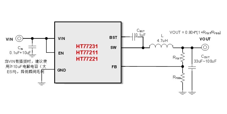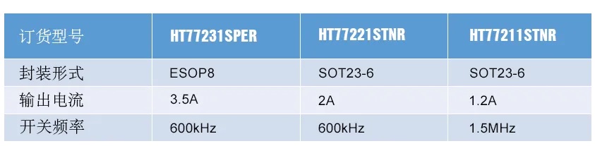 ・3.5A (HT77231) /2A (HT77221) /1.2A (HT77211) 降壓,內(nèi)置100mΩ和60mΩ功率管