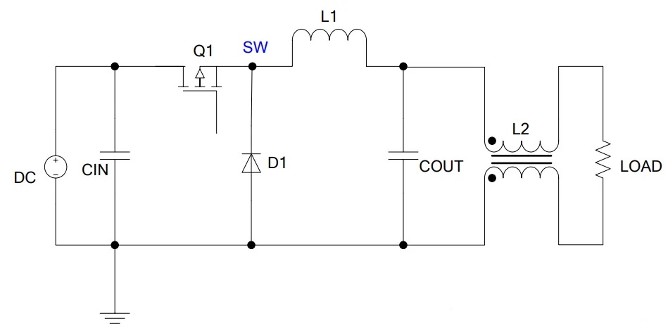 不論功率管 Q1 打開還是關斷,電流均流過 L1 和 COUT,表明流過 L1 和 COUT 處電流是連續(xù)電流, 流過 CIN、Q1、D1 的電流是開關電流,開關電流會在寄生電感上產生毛刺電壓,對外輻射電磁波。