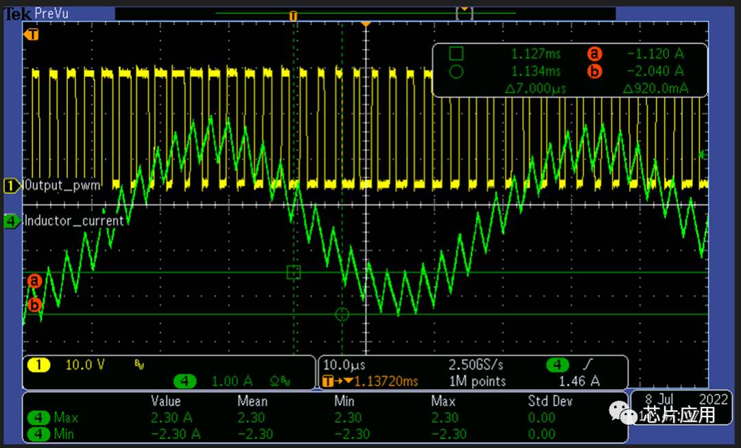 綠色波形 為流過電感電流, 黃色波形 為音頻功放輸出PWM。