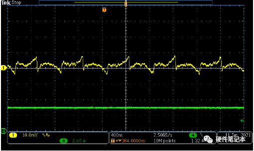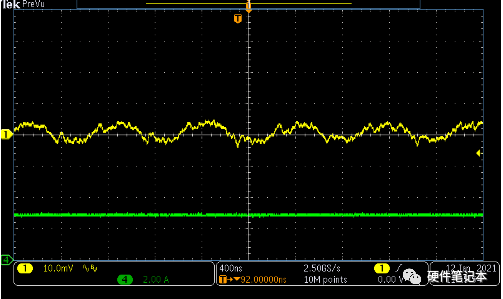 下圖是使用上述方式測得的輸出紋波波形。相較于圖3的波形,高頻的瞬變已得到了明顯的改善。