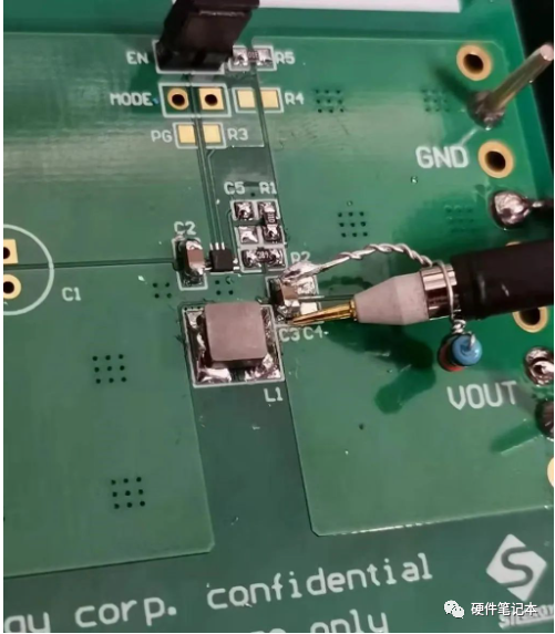但這仍然不是真正的開關穩(wěn)壓器的輸出紋波。這是因為示波器的探測尖端測量的是EVB板的輸出,其到開關穩(wěn)壓器的輸出之間的走線存在著寄生電感。
