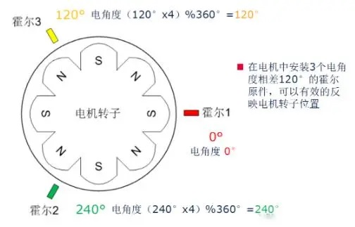 對(duì)于BLDC有感控制,要求BLDC電機(jī)本身裝有霍爾傳感器,電機(jī)霍爾傳感器安裝時(shí)需要相差120°,如下圖所示。