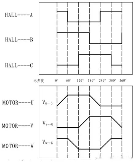 如下為一種電機(jī)的霍爾輸出與反電動(dòng)勢(shì)輸出示意,可知在電機(jī)霍爾A輸出由1變?yōu)?時(shí),控制U+開通。