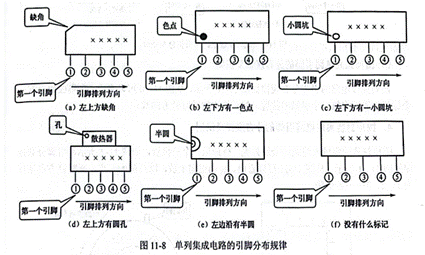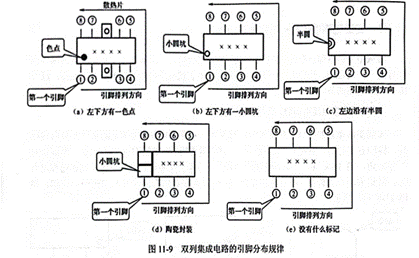 圖11—9(a),(b),(c),(d)所示為在集成電路的左側(cè)有一個標(biāo)記,此時左下角為個引腳1,按逆時針方向數(shù),依次為1、2、3··各引腳;圖11—9(e)所示是沒有什么標(biāo)記的,這時將集成塊正著放好,型號正面對著自己,左下角為個引腳1,按照逆時針方向數(shù),依次為1、2、3···各引腳。