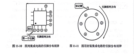四列集成電路的引腳分布規(guī)律如圖11—10所示,從圖11—10可以看出,在集成塊上有一 個標(biāo)記,表示出個引腳的位置,然后依次按逆時針方向數(shù)。