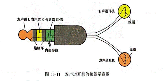 圖11—11所示是雙聲道耳機的接線示意圖,從圖中可以看出,耳機插頭有L、R、公共三個導(dǎo)電節(jié),由兩個絕緣環(huán)隔開,三個導(dǎo)電節(jié)內(nèi)部接出三根導(dǎo)線,一根導(dǎo)線引出后一分為二,三根導(dǎo)線變?yōu)樗母髢蓛膳c左、右聲道耳機線圈連接。