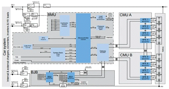 BMS由電池管理單元(BMU)、電池監(jiān)測單元(CMU)和電池接線盒(BJB)3個(gè)模塊組成,如何在作為系統(tǒng)大腦的BMU、CMU和BJB子系統(tǒng)之間建立BMS內(nèi)部通信也需要設(shè)計(jì)人員在選擇方案時(shí)做出仔細(xì)評(píng)估。