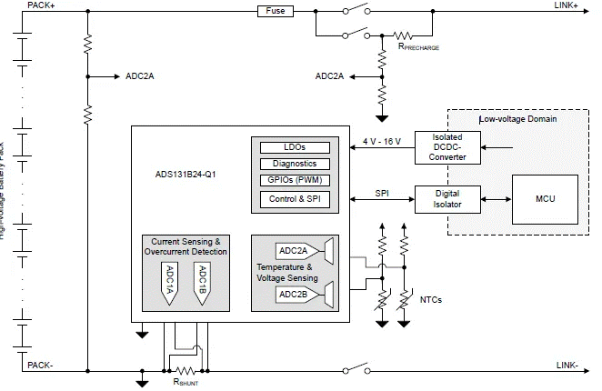 德州儀器(TI)ADS131B24-Q1是一款可用于電動(dòng)汽車HVBMS的電壓、電流和溫度檢測的產(chǎn)品,有很高的集成度,包括:兩個(gè)同步采樣、高精度的24位ADC 通道(ADC1A、ADC1B),可使用外部分流電阻以高分辨率和高精度測量電池電流;兩個(gè)獨(dú)立的數(shù)字比較器,可與兩個(gè)ADC并聯(lián)來實(shí)現(xiàn)快速過流檢測;還集成了兩個(gè)多路復(fù)用的16位ADC通道(ADC2A、ADC2B),可使用外部高壓電阻分壓器來測量分流器溫度和系統(tǒng)中的其它電壓,例如電池組電壓。分流器溫度通過熱敏電阻或模擬輸出溫度傳感器等外部溫度傳感器進(jìn)行測量。