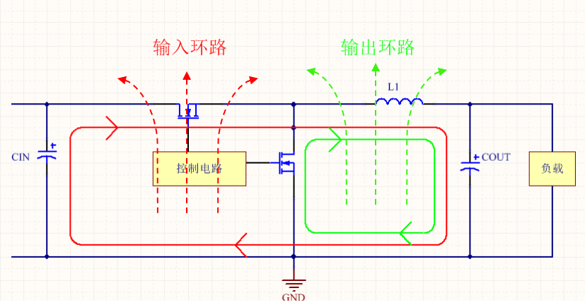 DC-DC芯片布板需遵循一個(gè)非常重要的原則,即開關(guān)大電流環(huán)路面積盡可能小。下圖所示的BUCK拓補(bǔ)結(jié)構(gòu)中可以看到芯片開關(guān)過程中存在兩個(gè)大電流環(huán)路。紅色為輸入環(huán)路,綠色為輸出環(huán)路。每一個(gè)電流環(huán)都可看作是一個(gè)環(huán)路天線,會(huì)對(duì)外輻射能量,引起EMI問題,輻射的大小與環(huán)路面積呈正比。