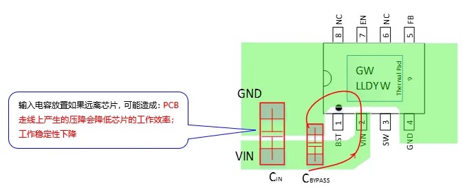 ① 對(duì)于BUCK芯片而言,要想使輸入環(huán)路盡可能小,輸入電容應(yīng)盡可能靠近芯片引腳放置;