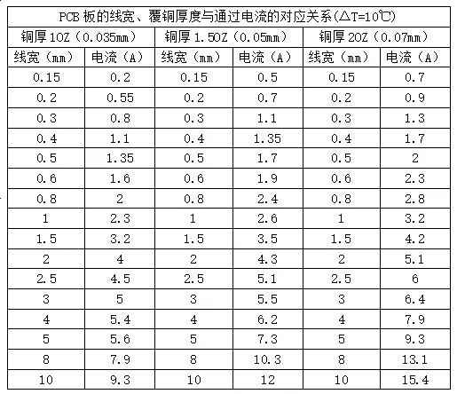 附上溫升10℃時(shí),PCB板的線寬、覆銅厚度與通過電流的對(duì)應(yīng)關(guān)系供參考。