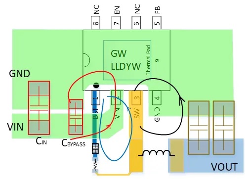 (注意:當(dāng)芯片引腳設(shè)置不足以讓我們同時(shí)兼顧輸入環(huán)路與輸出環(huán)路最小時(shí),對(duì)于BUCK而言,應(yīng)優(yōu)先考慮輸入部分回路布線最優(yōu)化。因?yàn)檩敵龌芈分须娏魇沁B續(xù)的,而輸入回路中電流是跳變的,會(huì)產(chǎn)生較大的di/dt,會(huì)引起EMI問題的可能性更高。如果是BOOST芯片,則應(yīng)優(yōu)先考慮輸出回路布線最優(yōu)化。)