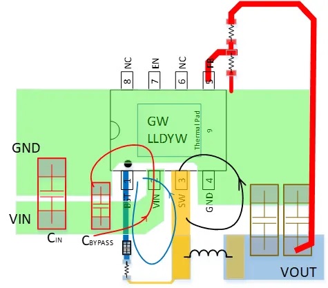 ③ SW節(jié)點(diǎn)要以最小面積處理大電流,防止銅箔面積變大會(huì)起到天線的作用,使 EMI增加;