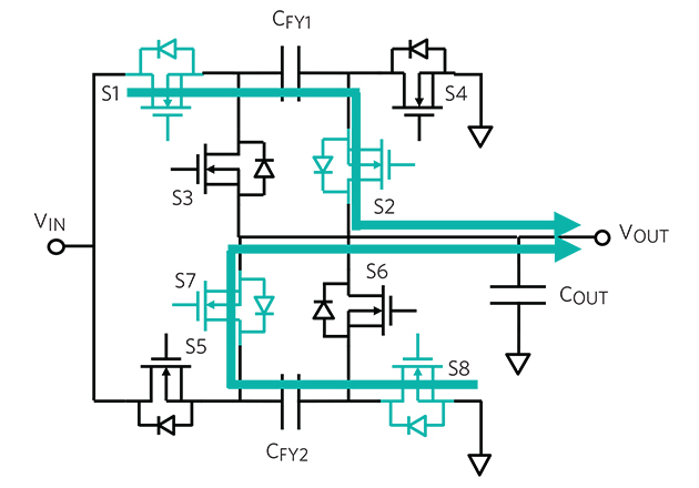 下一個(gè)周期與前一個(gè)周期完全對稱:S1 和 S2 關(guān)閉,S3 和 S4 打開,CFLY1 為負(fù)載供電。同時(shí),S7 和 S8 關(guān)閉,S5 和 S6 打開。CFLY2 充電,同時(shí)也為負(fù)載供電。兩相操作減少了輸出電容上的紋波。